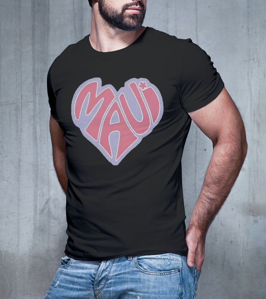 Maui Heart Retro T-shirt — on-model front view, hands near pockets.