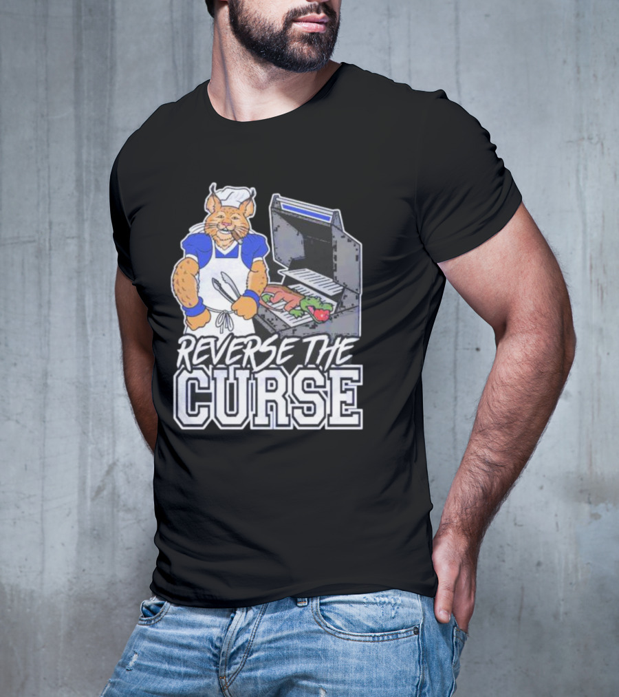 Reverse The Curse Cat Grilling Gator T-shirt — on-model front view, hands behind back.