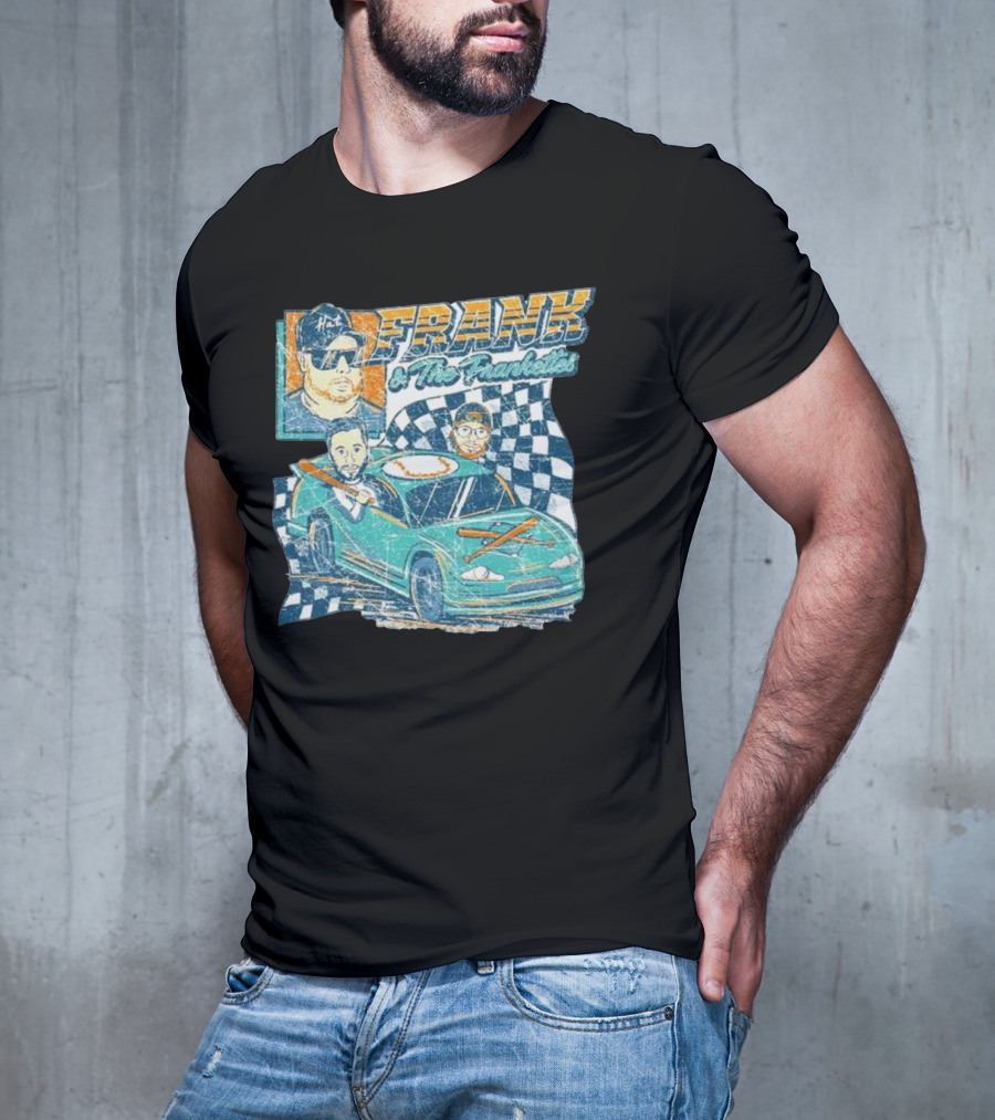 Frank And The Frankettes Racing Car Adventure With Checkered Flags And Cartoon Characters T-Shirt