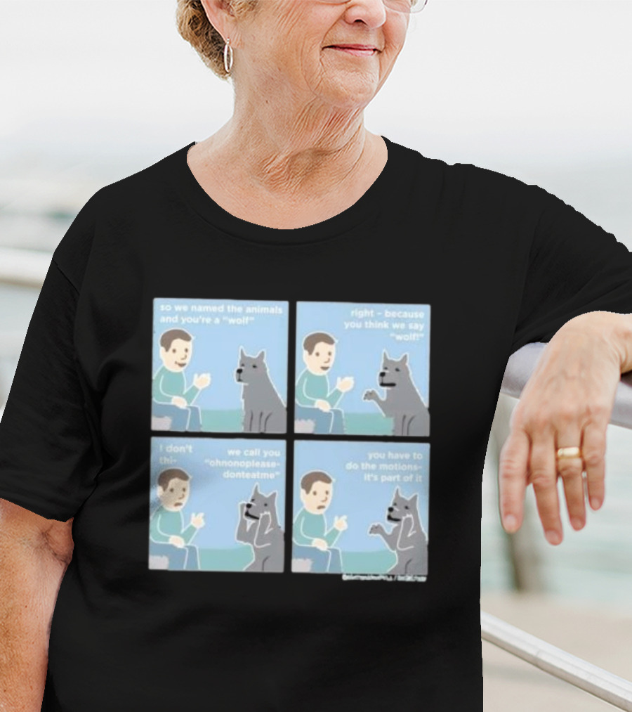 So We Named The Animals And You're A Wolf Right Because You Think We Say Wolf Oh Non Please Don't Eat Me You Have To Do The Motion It's Part Of It T-Shirt