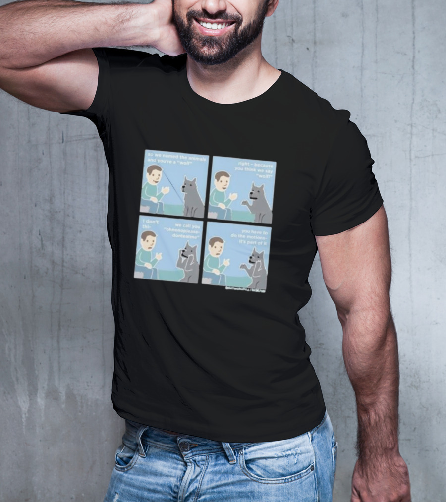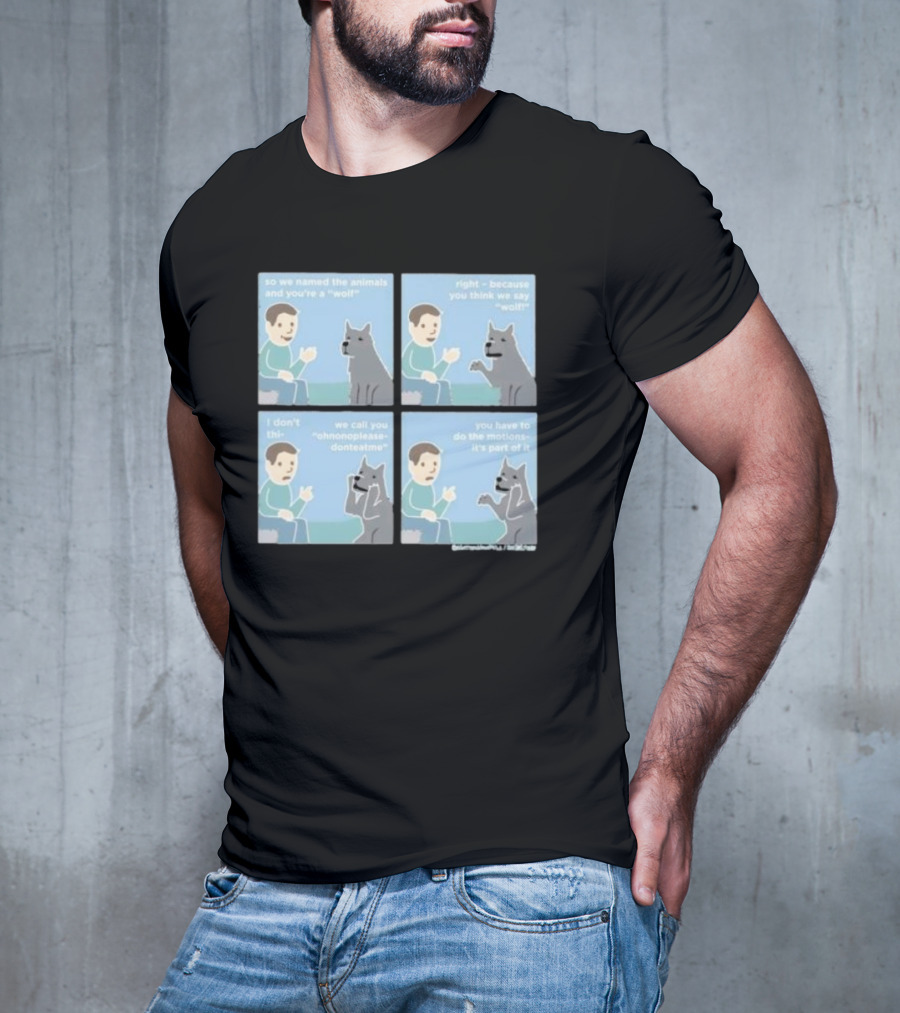 So We Named The Animals And You're A Wolf Right Because You Think We Say Wolf Oh Non Please Don't Eat Me You Have To Do The Motion It's Part Of It T-shirt — on-model front view, hands behind back.