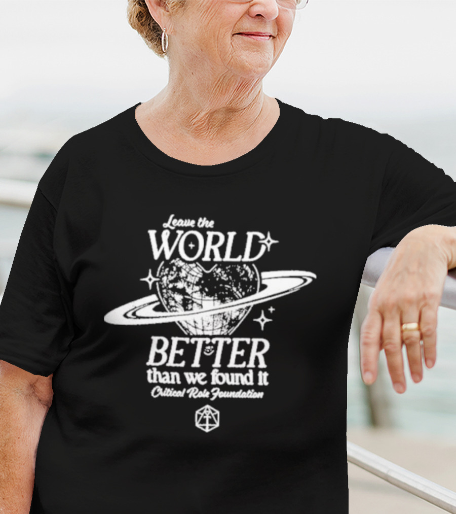 Leave The World Better Than We Found It Critical Role Foundation Saturn Planet Earth T-shirt — on-model front view, hands behind back.