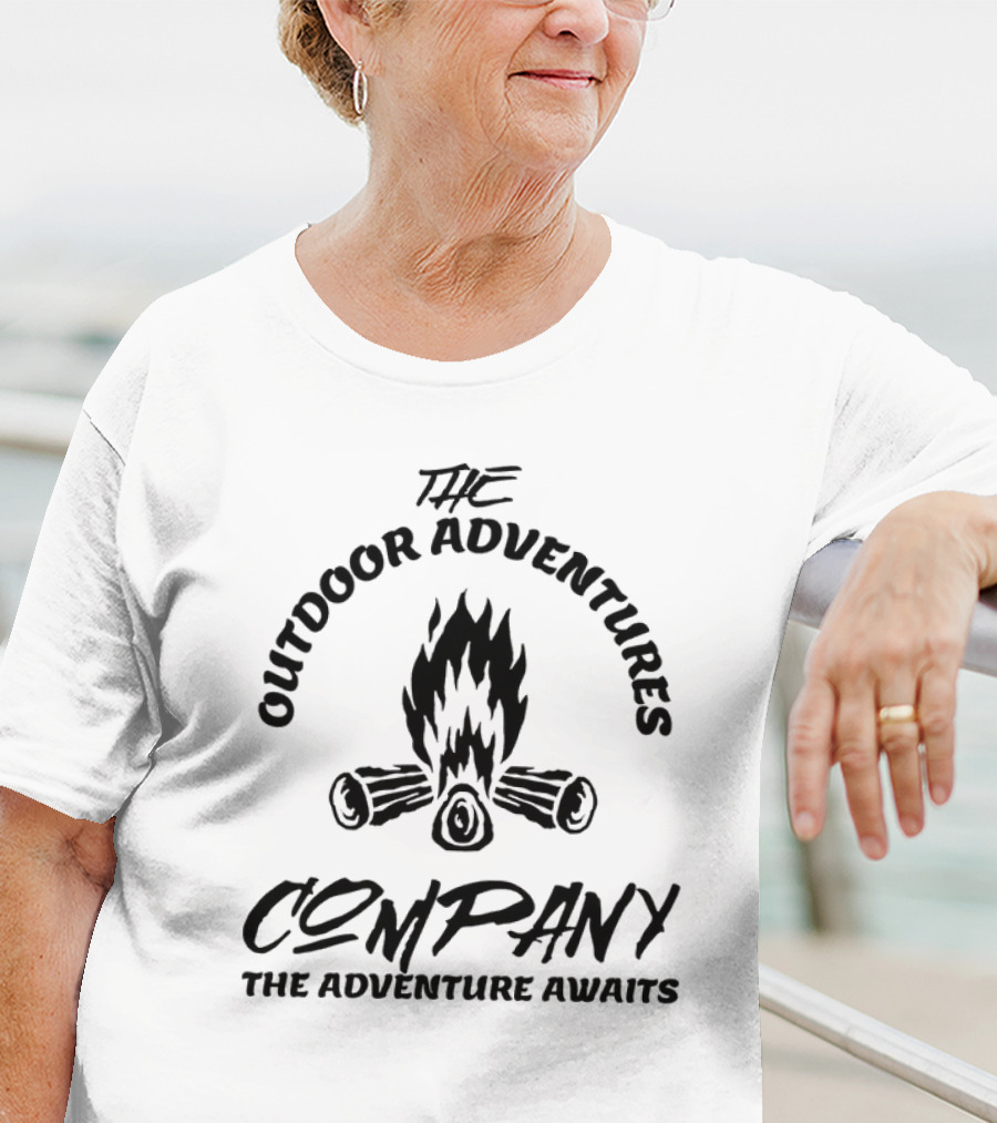 The Outdoor Adventures Company The Adventure Awaits Campfire Logs T-shirt — older female model, leaning on railing, front view.