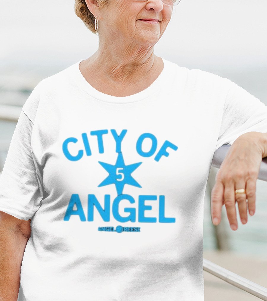 City of Angel 5 Star Angel Reese T-shirt — older female model, leaning on railing, front view.