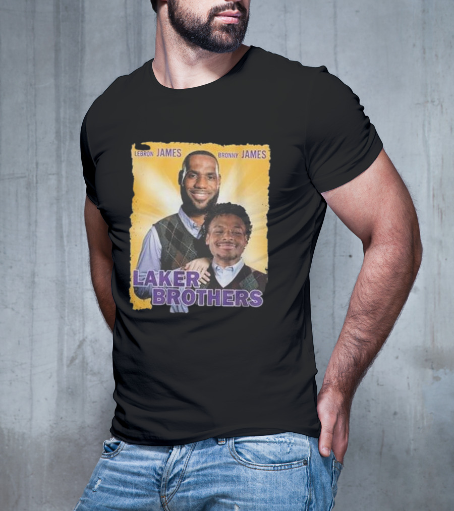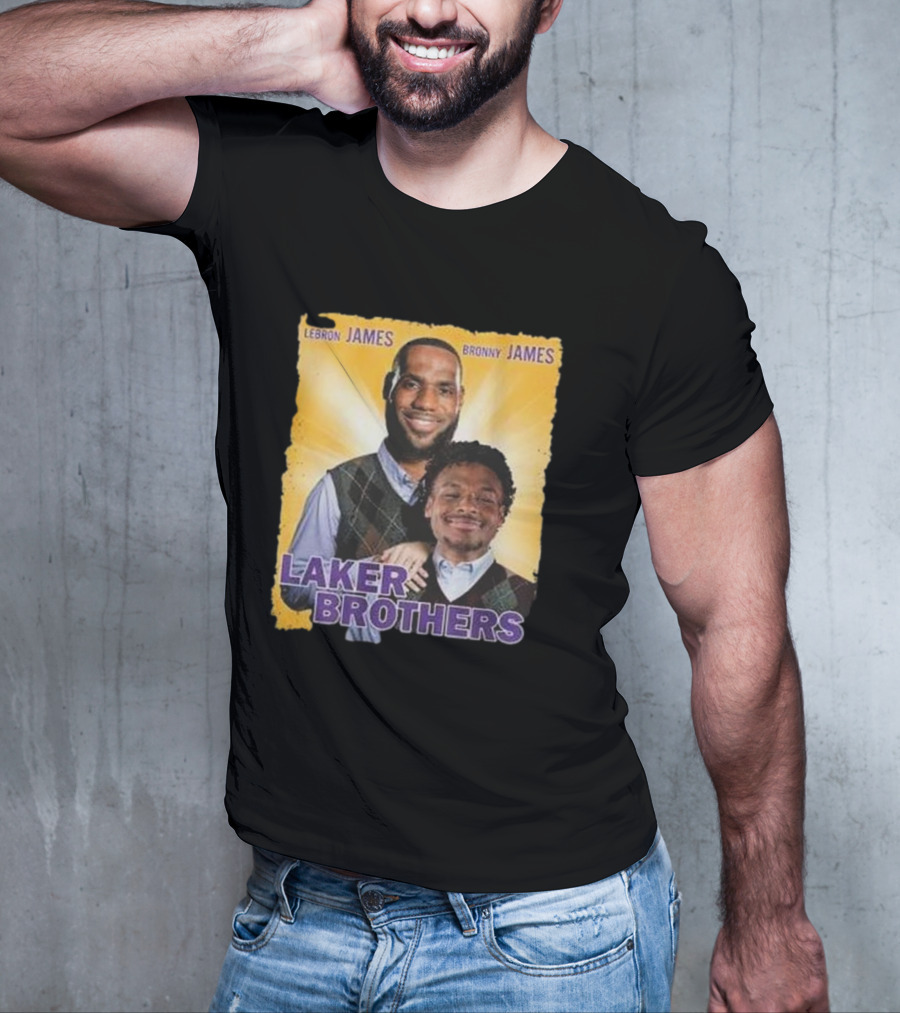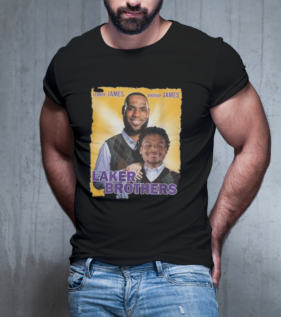 Lebron James Bronny James Laker Brothers T-shirt — on-model front view, hands behind back.