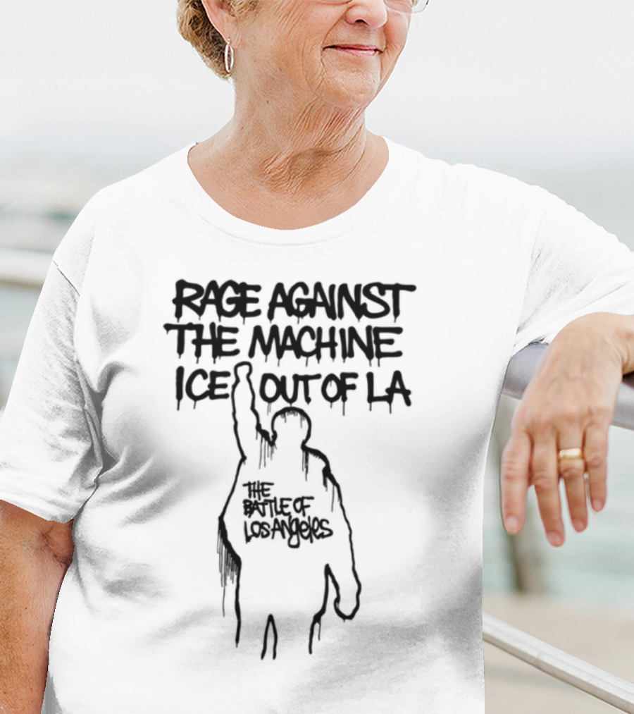 Rage Against The Machine Tom Morello The Battle Of Los Angeles T-shirt — older female model, leaning on railing, front view.