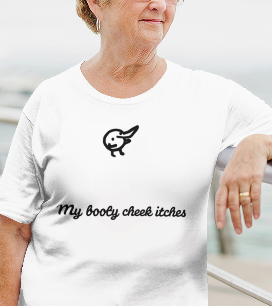 My Booty Cheek Itches Funny Butt Scratching Cartoon T-shirt — older female model, leaning on railing, front view.